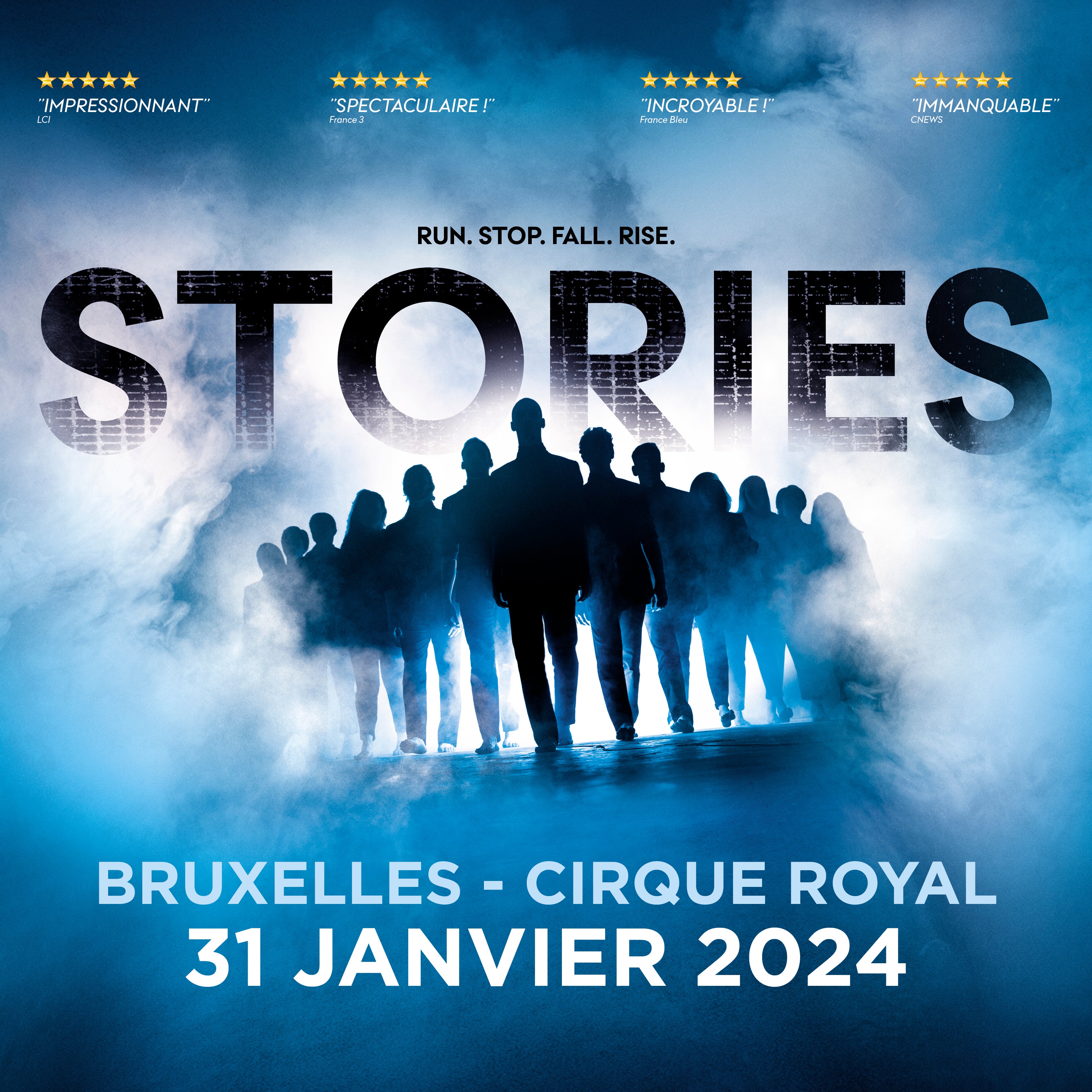 RB Production présenteSTORIES, LA DERNIÈRE TOURNÉEAprès plus de 100 000 spectateurs en France et à l’international, le phénomène reprend une dernière fois la route en 2026 !Entre tradition et modernité, Stories donne aux claquettes une impulsion nouvelle. Élégance et explosivité se mêlent pour donner vie à un spectacle narratif d'1h15 au rythme effréné. Le spectacle retrace l'histoire d'Icare, un jeune acteur dont les films connaissent un franc succès et qui, dans l'ombre, subit l'ascendance oppressante de son réalisateur. Après une dispute avec ce dernier, le jeune homme se retrouve prisonnier du film qui le lie au cinéaste.Lauréat de 3 Trophées de la Comédie Musicale, Stories est le premier spectacle de la RB Dance Company, la compagnie créée par Romain Rachline Borgeaud. Finaliste de La France a un Incroyable Talent , la RB arpente les plateaux TV comme Le Late d’Alain Chabat , Danse avec les Stars , Le Grand Echiquier et Miss France . La compagnie française se produit désormais sur les plus grandes scènes internationales.