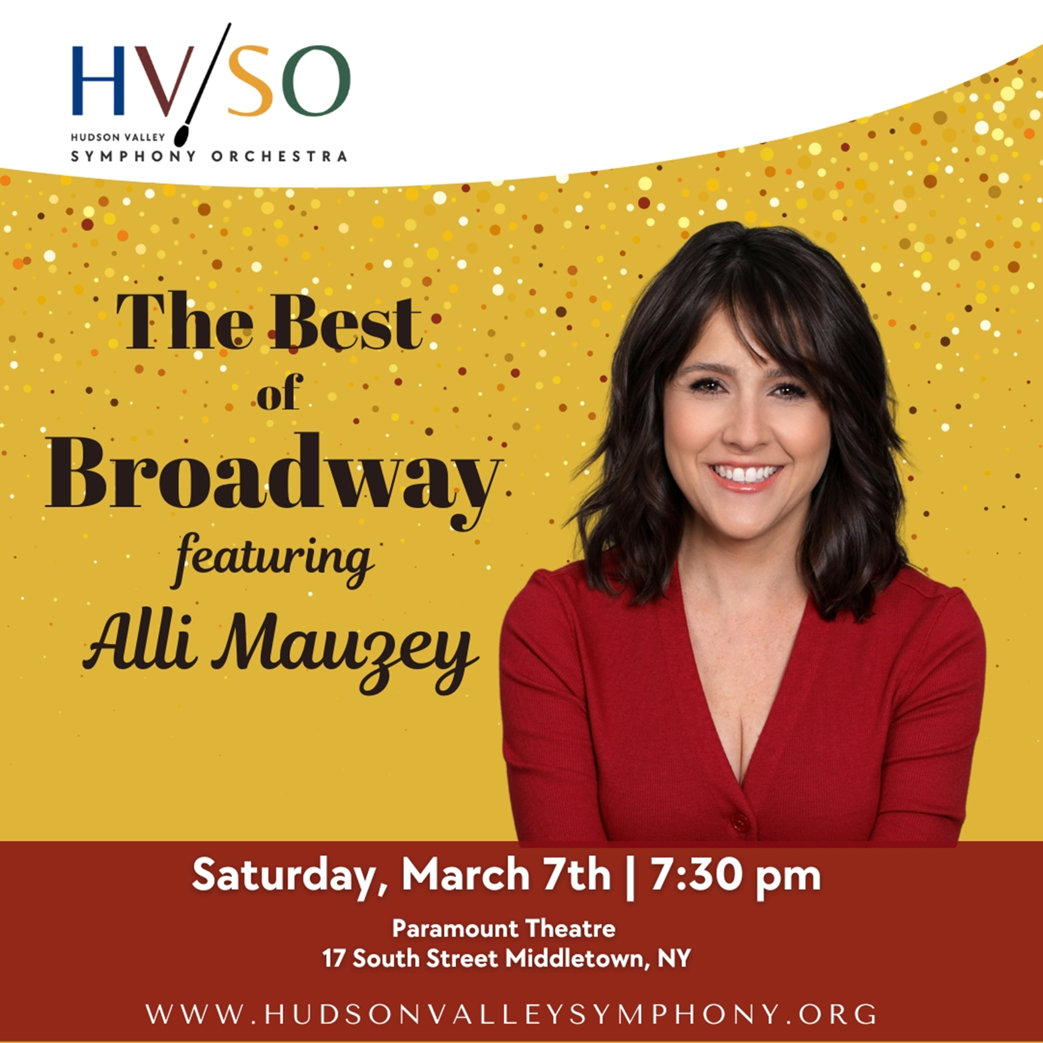 The Hudson Valley Symphony Orchestra Presents The Best of Broadway featuring Alli Mauzey Taking place Saturday, March 7th at 7:30 PM. Broadway comes to the Hudson Valley on March 7th and 8th! Vocalist Alli Mauzey joins the Hudson Valley Symphony Orchestra with showstopping hits from Wicked, Chicago, Frozen, Phantom of the Opera, and more. Join us for tunes from the golden age to the latest blockbusters. Reduced ticket prices are available for seniors and students, and children under 5 are invited free of charge (must go through the box office). Music and theater lovers of all ages are welcome to attend!